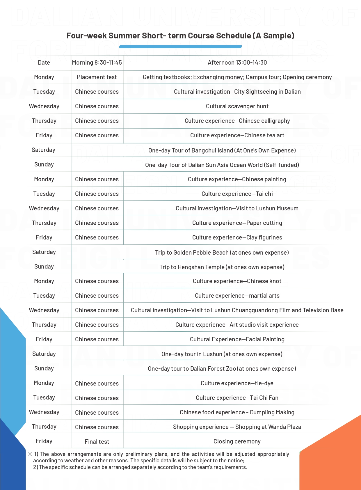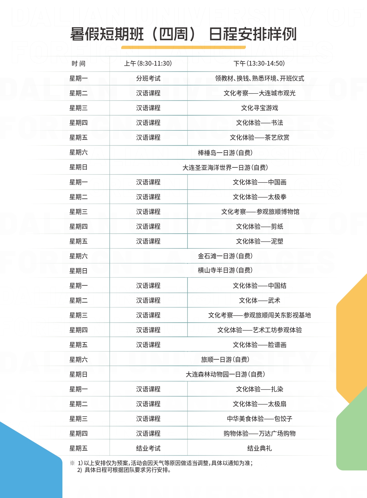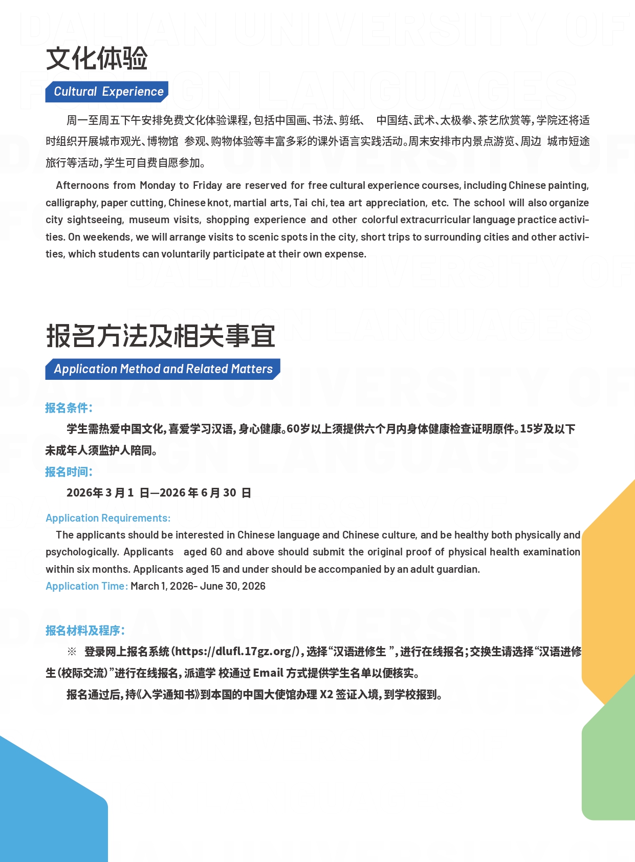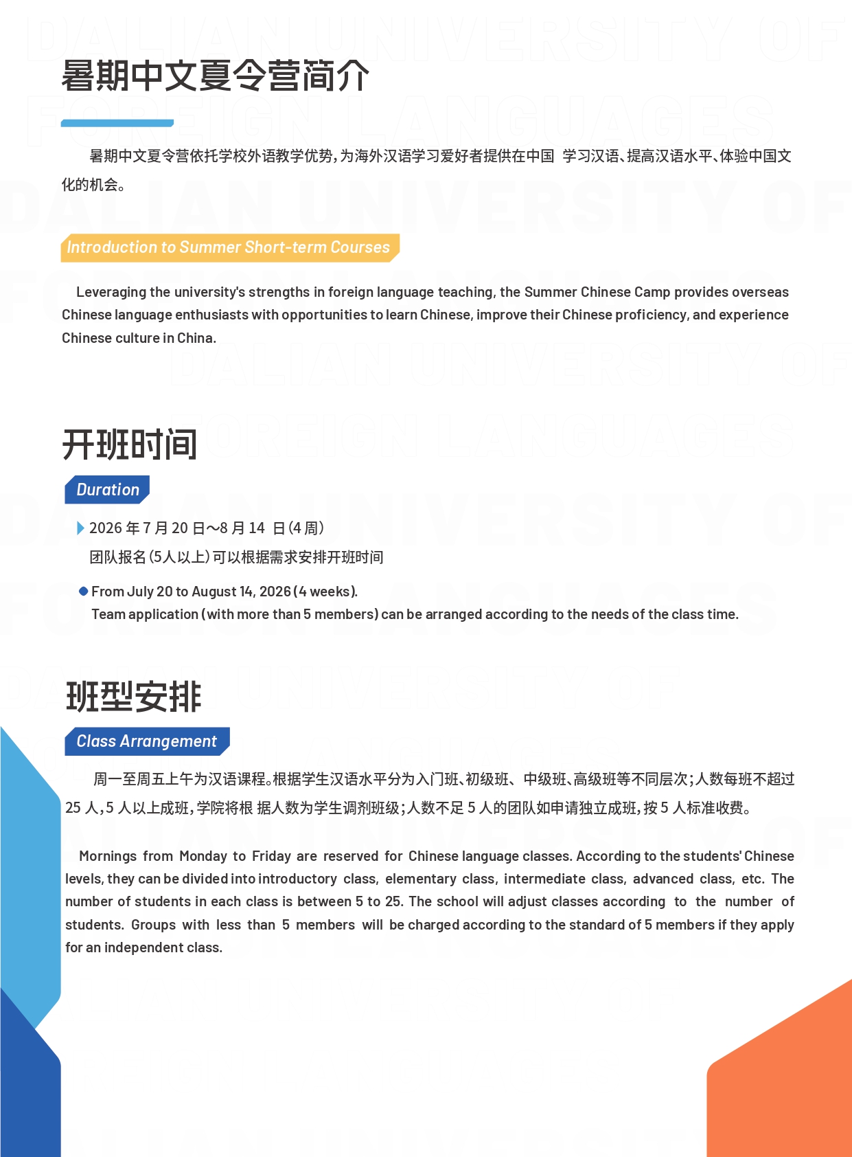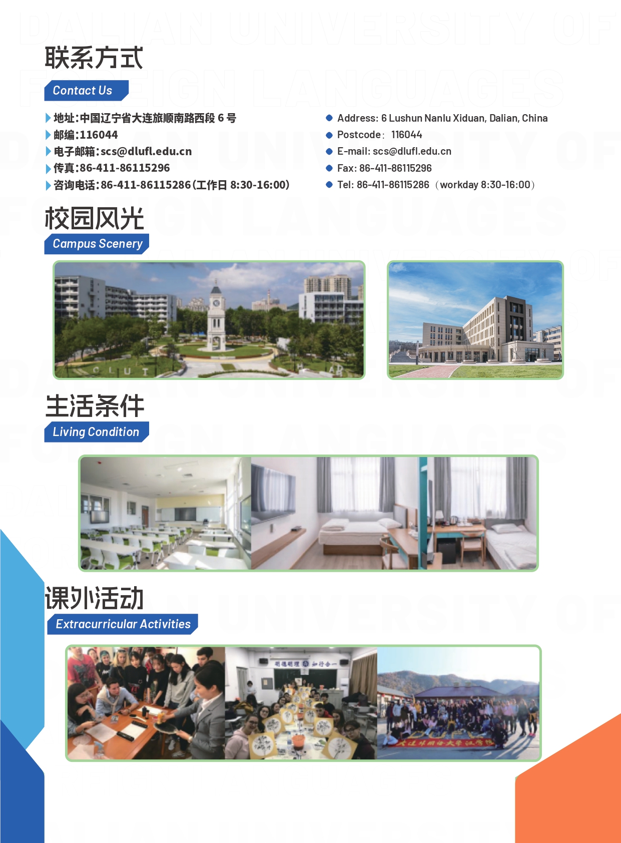 语种 / Languages 大连外国语大学2026暑期中文夏令营招生简章 大连外国语大学汉学院2025暑期短期班招生简 联系我们 / CONTACT US 08:30-12:00 | 13:15-16:45 国际招生办: +86-0411-86115286 +86-0411-86115206 招生邮箱: scs@dlufl.edu.cn 传 真: +86-0411-86115296 办公电话: +86-0411-86115292 辽宁省大连市旅顺南路西段6号 大连外国语大学国际中文教育大楼315室/321室 首页 / 国际招生 / 短期进修 大连外国语大学2026暑期中文夏令营招生简章