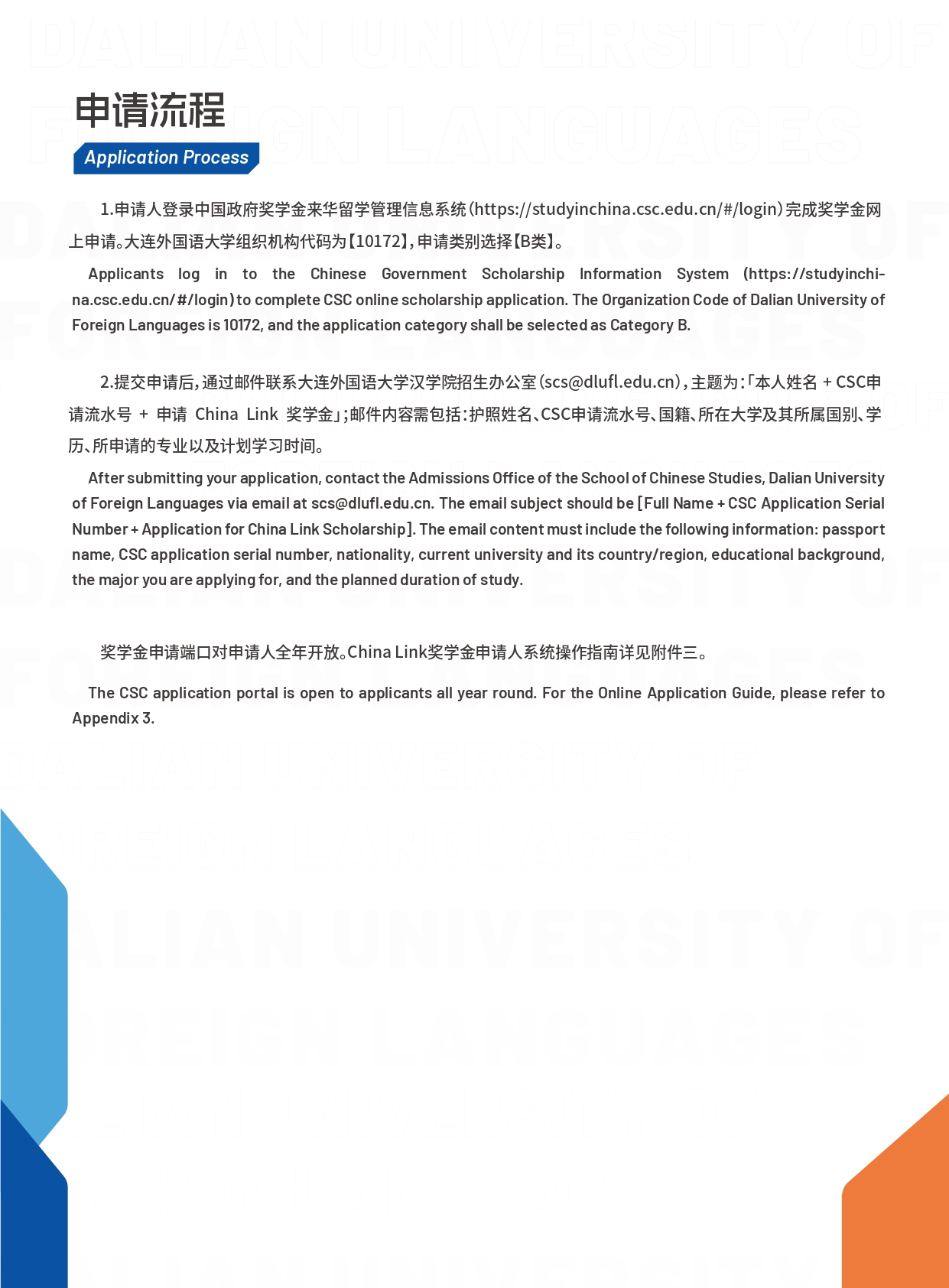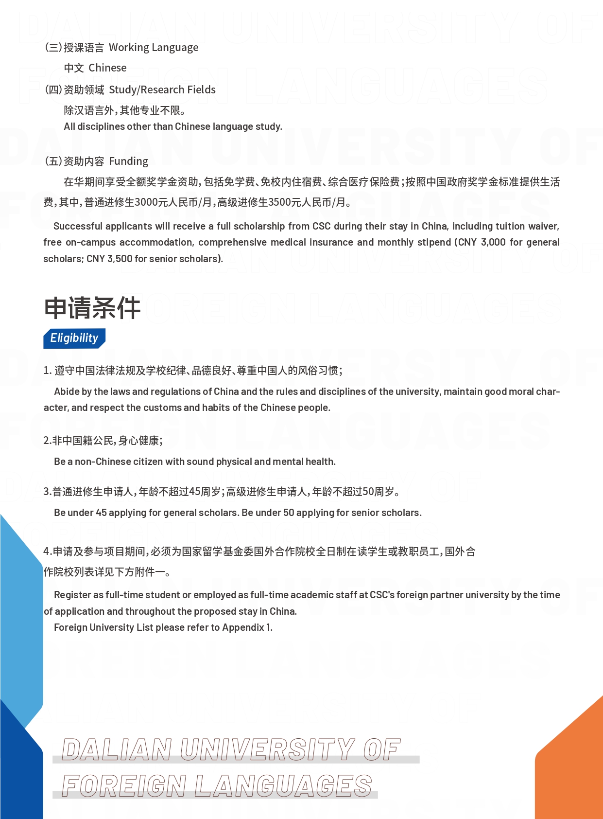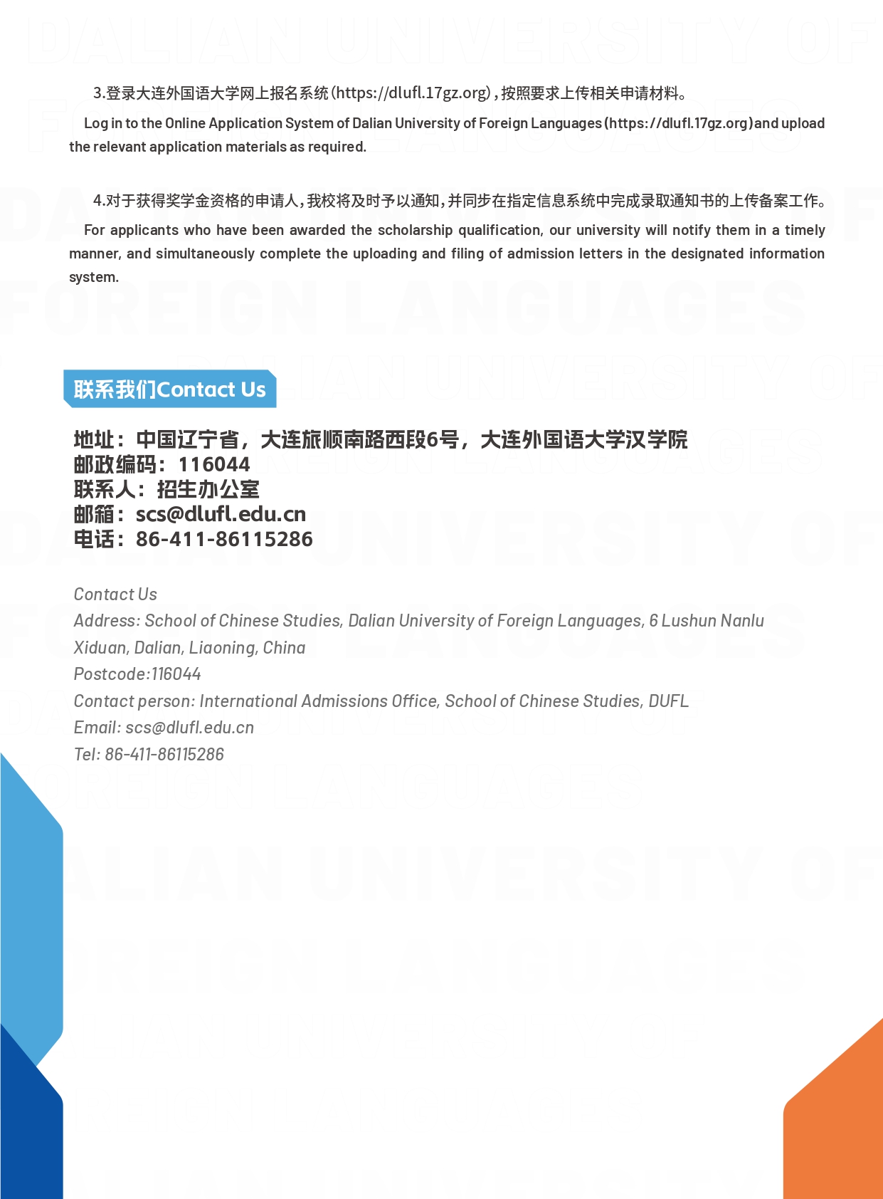 语种 / Languages 大连外国语大学中国政府奖学金短期科研交流 中国政府奖学金“高水平研究生”项目招生简 联系我们 / CONTACT US 08:30-12:00 | 13:15-16:45 国际招生办: +86-0411-86115286 +86-0411-86115206 招生邮箱: scs@dlufl.edu.cn 传 真: +86-0411-86115296 办公电话: +86-0411-86115292 辽宁省大连市旅顺南路西段6号 大连外国语大学国际中文教育大楼315室/321室 首页 / 国际招生 / 中国政府奖学金 大连外国语大学中国政府奖学金短期科研交流项目