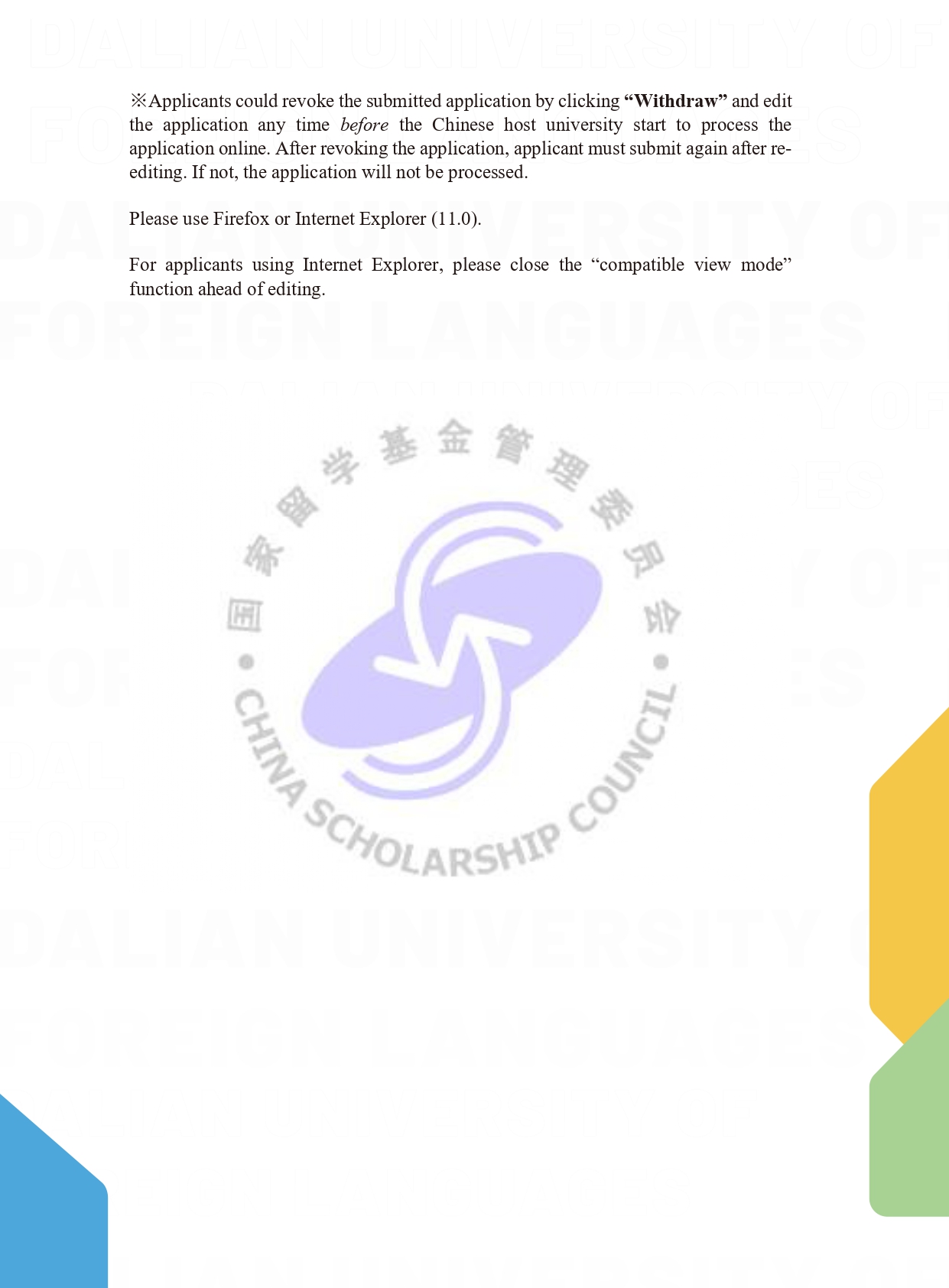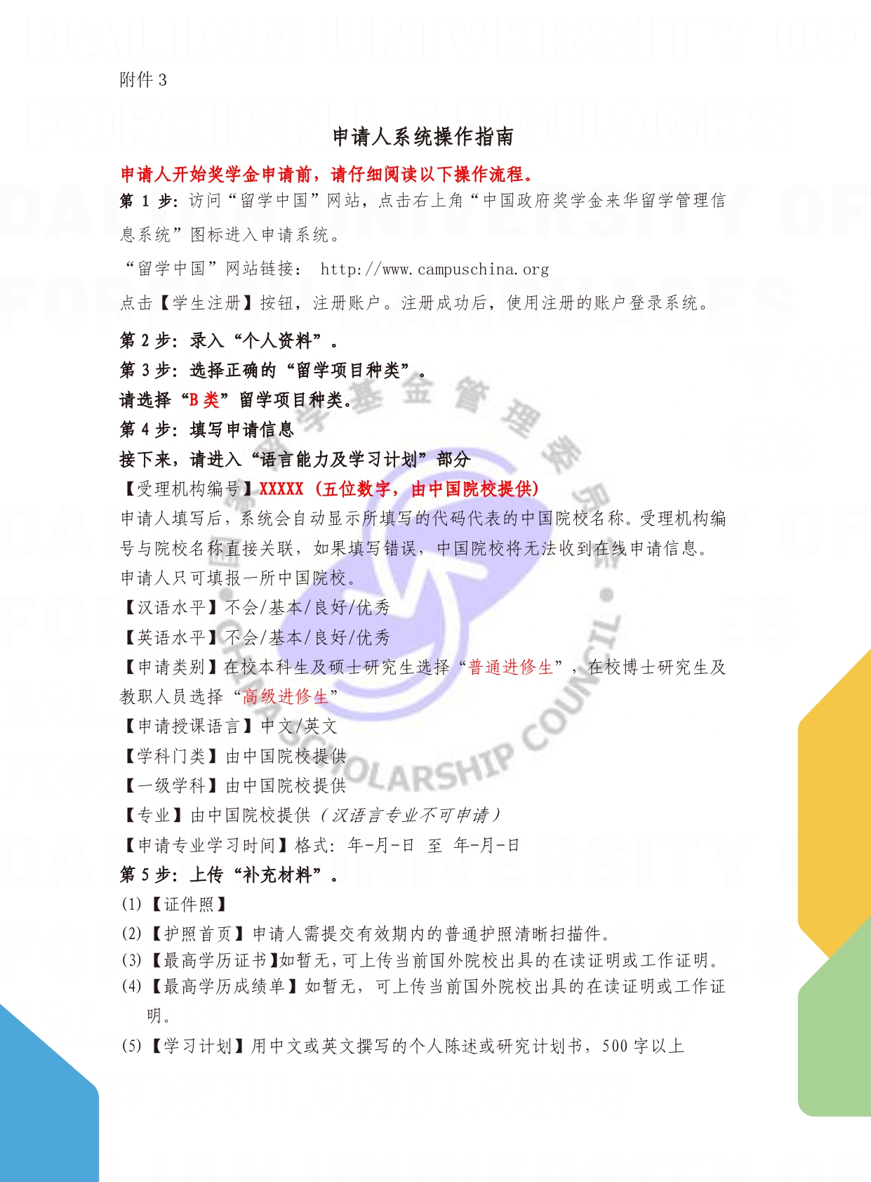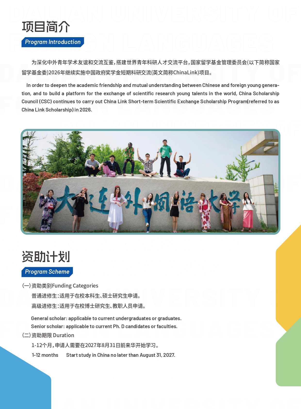 语种 / Languages 大连外国语大学中国政府奖学金短期科研交流 中国政府奖学金“高水平研究生”项目招生简 联系我们 / CONTACT US 08:30-12:00 | 13:15-16:45 国际招生办: +86-0411-86115286 +86-0411-86115206 招生邮箱: scs@dlufl.edu.cn 传 真: +86-0411-86115296 办公电话: +86-0411-86115292 辽宁省大连市旅顺南路西段6号 大连外国语大学国际中文教育大楼315室/321室 首页 / 国际招生 / 中国政府奖学金 大连外国语大学中国政府奖学金短期科研交流项目