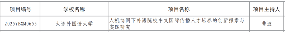 近日,2025年度辽宁省普通高等学校本科教学改革研究项目立项结果公布。我院副院长曹波主持申报的《人机协同下外语院校中文国际传播人才培养的创新探索与实践研究》项目成功获批立项。这一喜讯不仅是汉学院持续深化教育教学改革的有力见证,也标志着学院在智能技术与中文国际传播人才培养深度融合领域迈出了坚实一步。