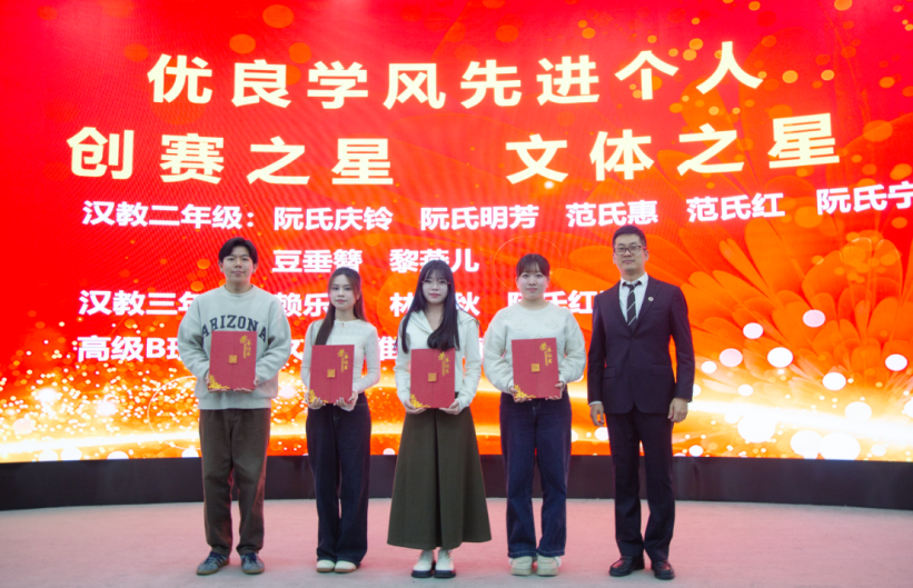 此外,典礼还特别表彰了本学期“优秀学生干部”、“优良学风先进个人”,以及“创赛之星”和“文体之星”等专项奖项。这不仅是对他们努力的认可,更是对这段求学时光的最好纪念。汉学院副院长安晓燕宣读了表奖名单,汉学院党总支书记李虹瑾、副书记刘鑫分别为获奖学生颁发了荣誉证书。