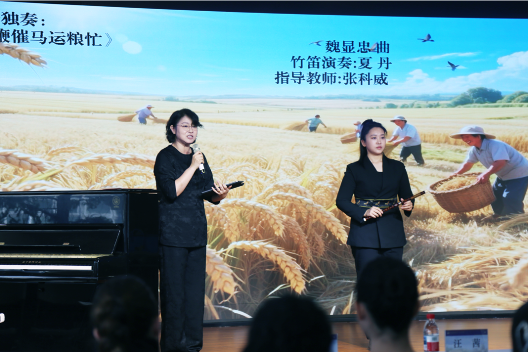 演出在热烈的掌声中拉开帷幕。沈阳音乐学院民族器乐系党总支教工支部书记汪茜副教授为每首曲目作了生动讲解,使观众在聆听音乐的同时,深入理解每件乐器与曲目背后的文化意蕴。从魏显忠创作的笛子独奏《扬鞭催马运粮忙》,传递出劳动人民奋发向上的精神面貌;到周维作曲、王琳副教授与汪茜副教授联袂呈现的二胡与钢琴《葡萄熟了》,融合新疆音乐元素,展现民族音乐的包容与生机;再到中阮齐奏《丝路驼铃》以含蓄柔美的音色勾勒丝路意象;以及琵琶重奏《唱支山山歌给党听》以清越交融的声部表达人民对党的深情礼赞;最后,唢呐独奏《胜利秧歌》高亢热烈,传递出“尊重人民、依靠人民、为了人民”的深厚情怀。