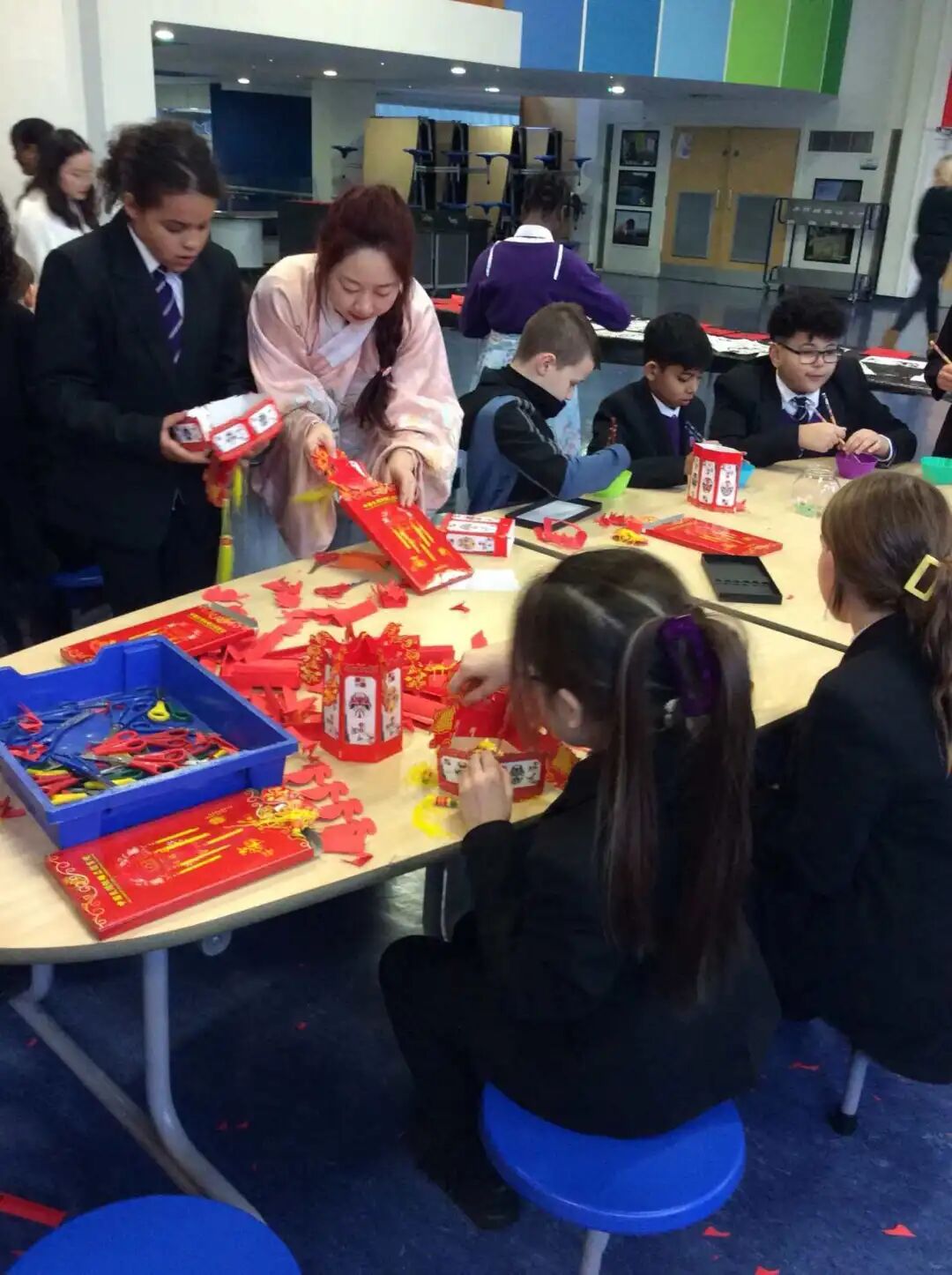 为了让汉语学习更生动有趣,常常创新教学形式:带领学生制作姓名牌、熊猫手工作品、汉语钟表与动物面具,让课堂充满创意;参与装饰汉语墙,将中华文化元素融入校园环境;端午节时组织学生折纸船,开展水上漂流比赛;春节期间举办庆祝活动,让外国学生亲手体验用筷子夹弹珠、穿汉服、剪纸、写福字,在沉浸式体验中感受中华文化的魅力。
